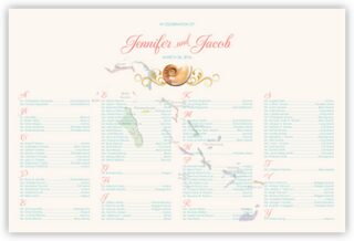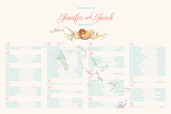 Customize your wedding reception or special event with this seating chart featuring a map of the Bahamas faded into the background, as well as a seashell pattern adorning the top. The seating chart is 100% customizable, with any fonts, colors, or borders that you might want to use. The map may also be changed to any country of your choice. Printed with acid-free inks on a heavy-weight watercolor paper.