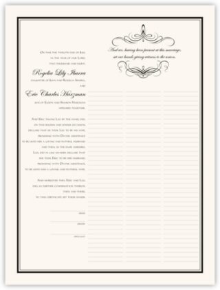 Add a touch of elegance to your wedding with this flourish marriage certificate. Your unique vows or verse will be set to the left of the wedding document, with your guests signing to the right. This certificate features a classic and timeless design and is a unique ceremony tradition.