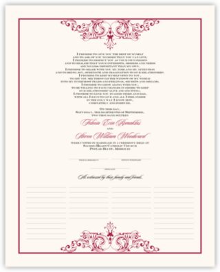 This vintage wedding certificate and marriage document features a customizable vintage flourish and a burgundy single line border. Wedding certificates can be used in place of or in conjunction with a guest book and are hung in your home to remind you of your vows and your wedding day.
