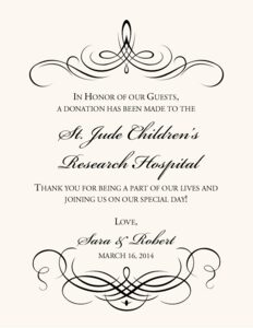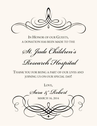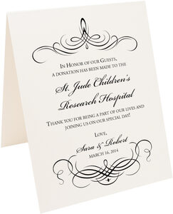 It is becoming more and more common to give a charitable donation on your wedding day in lieu of or in addition to traditional favors. Let your guests know the charity that you have chosen with these classic donation cards. They come in two styles, as a flat card that you might display near each plate on the tables, or as a tent that stands on its own that you could place near the center of the table or on each plate. Let us customize any of our donation cards with your choice of wording as well as our wide selection of fonts, borders, colors, flourish monograms, or illustrations.