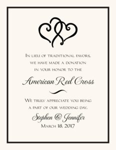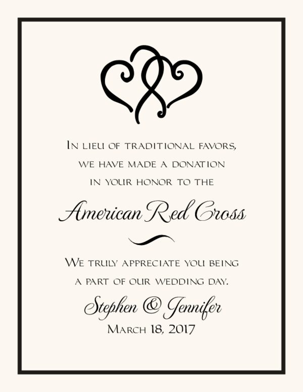 These wedding donation cards feature two linked hearts at the top. As more and more couples are donating to charity in lieu or in addition to traditional favors, what better way to let your guests know what charity the new husband and wife support most. Customize any aspect of this design, from your choice of colors, borders and fonts or replace the verse on the sample with your own verse or vows. We also have many heart designs to choose from in our library that you may use as a replacement or in addition to the design sample.