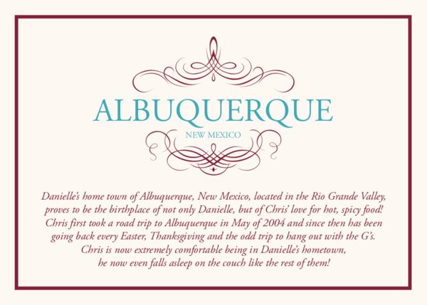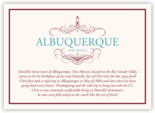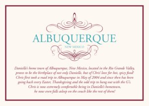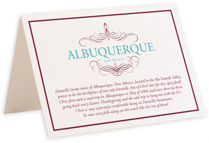 Instead of numbering your tables, spice them up by naming each of them after something that is important to you. Send us a unique short description or paragraph for each card, and feel free to request any changes to the fonts, colors or borders.
