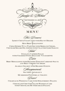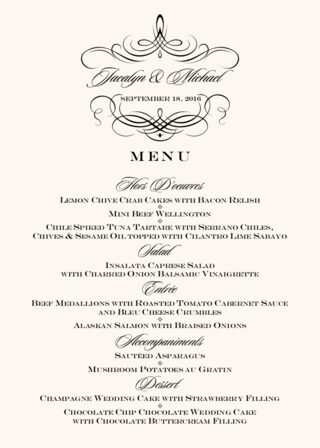 Add a classic touch to your party, rehearsal dinner or wedding reception with this Flourish Monogram wedding menu card. Customize it with your menu and your choice of flourish monograms, fonts, borders, monograms, or illustrations.