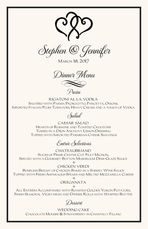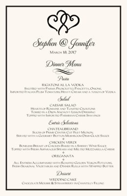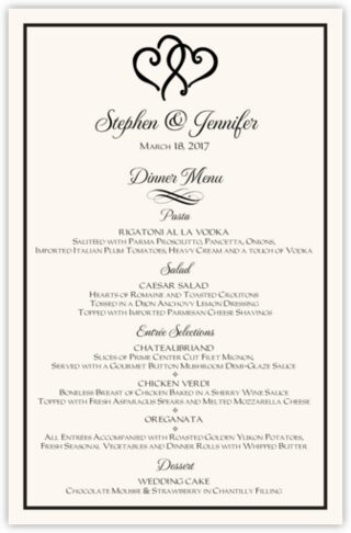 These custom Linked Hearts wedding reception menu cards provide an elegant and romantic way to let your guests know what they will be dining on at your wedding. Each card is 100% customizable with your menu information. We can also change the Heart illustration, fonts, borders or colors to one of your liking.