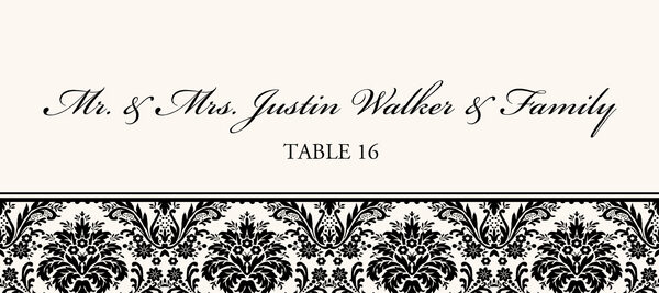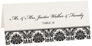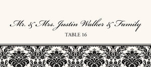These place cards feature an elegant damask pattern printed across the bottom of each card in your choice of color. Each place card is printed on a high-quality, metallic, shimmering heavy-weight card stock. Each card can be customized with your individual guest names.