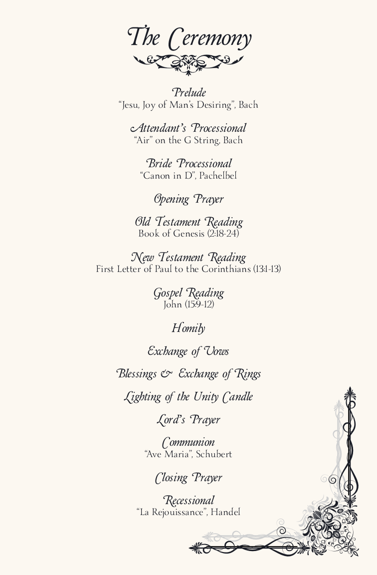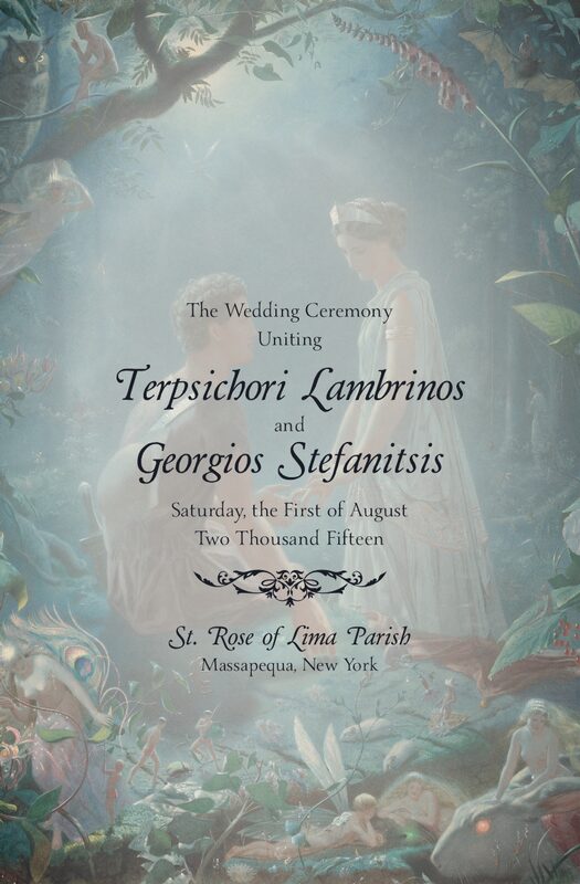 This wedding program features a watercolor painting depicting Hermia and Lysander lost in an enchanted wood together from Shakespeare's famous "A Midsummer Night's Dream". The fonts and flourishes used maintain the Victorian feel from the painting, and would be a perfect addition to your Victorian or Midsummer Night's Dream themed wedding.