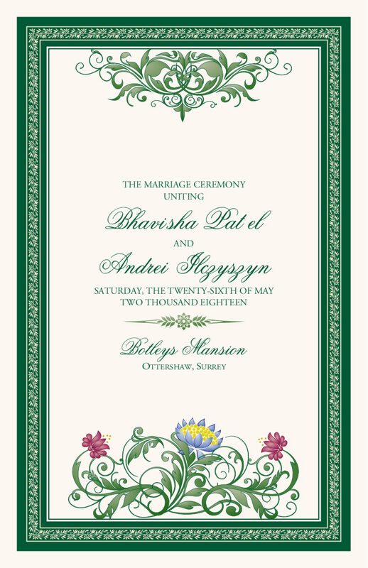 The Moon Bloom wedding ceremony program features a Gothic vine border and a unique, contemporary floral design on the top and bottom of the cover. The same design elements are used throughout and can be customized in any way. Shown with a traditional Indian wedding ceremony template, the design is universal and also works for any other religion or non-denominational wedding.
