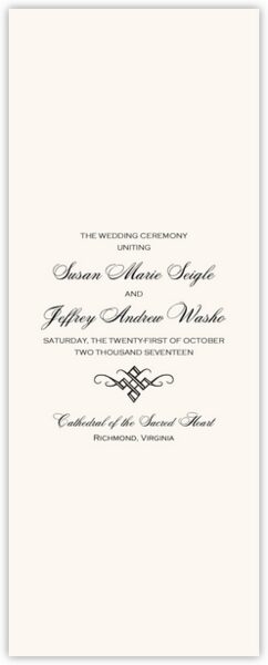 This wedding program is a classic, minimalist design, and relies on heavily on fonts and flourishes to make the design. Any of our Artwork, Monograms or borders can be added as well.