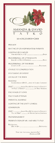 Choose from our collection of original wedding program designs or collaborate with us on a custom design by mixing and matching elements from the hundreds of resources that we offer. Browse the site for great ideas. Place an order with your own customization. Edit the free proofs that we send and finalize the order at your convenience.The possibilities are endless...Indicate your custom preferences on the order form.