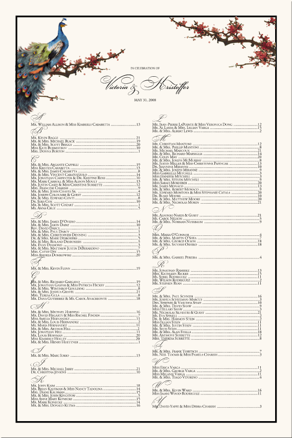 Seating Charts are used at a wedding reception or other special event to direct the guests to their tables. They are typically displayed at the entrance of the event, framed and placed on an easel. Seating assignments can be indicated by table numbers or table names. The chart can also be organized alphabetically or by tables. Additions to seating charts are wedding party listing, menu, verse, donation and favor information and room map.