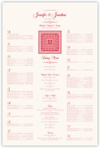 Bring a touch of the Far East to your wedding with this Chinese Double Happiness Pattern seating chart. Let us customize it with your choice of colors or fonts, or let us add a border.