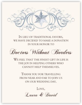 The Curly Sue Snowflake donation cards features the Curly Sue Vinatage Monogram with a holiday touch. Customize these donation cards by changing the font or colors to match your current wedding theme.