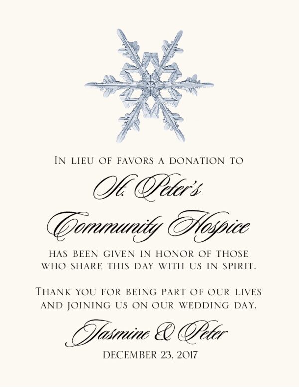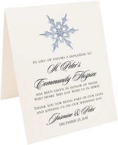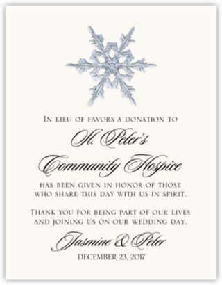 In addition or in place of the traditional favors, couples are more and more frequently opting to make a donation to charity. Let your guests know which charitable organization means most to you with these snowflake donation cards. These donation cards can be customized with your choice of text, snowflakes, fonts, borders, or colors.