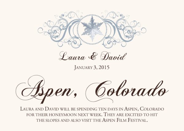 The Curly Sue Snowflake memorabilia table cards feature the Curly Sue Vinatage Monogram with a holiday touch. Customize these cards by adding your own personal stories, and change the font or colors to match your current wedding theme.