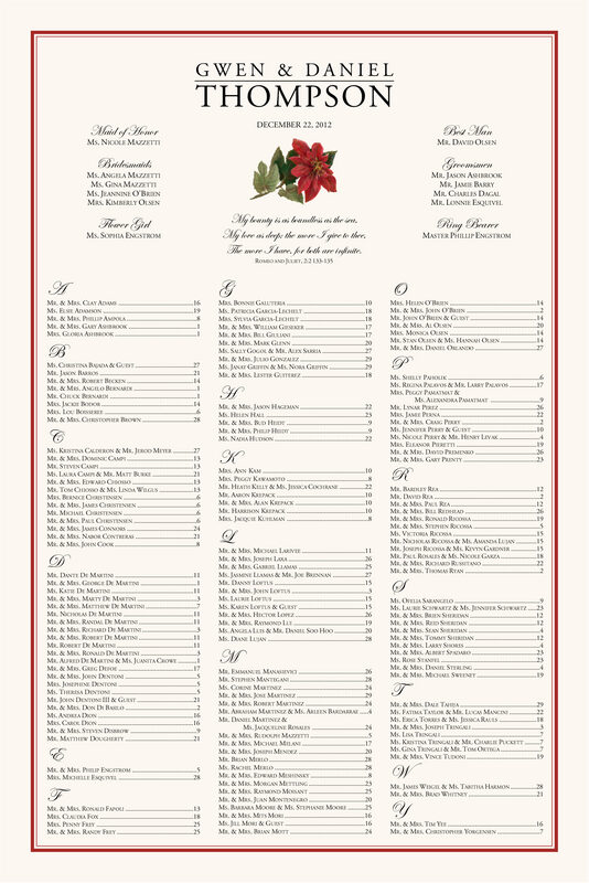 Our Poinsettia Wedding Seating Chart is perfect for your Winter or Holiday wedding. Use it in place or in addition to our poinsettia or snowflake place cards for a unique way welcome guests out of the cold and into your reception. Seating charts can be customized in any way you can imagine. Feel free to let us change the font, border, colors, or add your wedding party or reception menu to it.