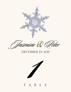 These Snowflake Assortment wedding table numbers would make a perfect addition to your Winter wedding. Each card is 100% customizable with your choice, of fonts, colors, borders, or a different monogram. Don't forget to check out the match Snowflake Assortment Place Cards to complete the look!