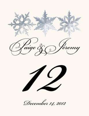 These unique snowflake pattern table numbers feature three customizable snowflakes at the top of each card. Customize each card with the bride and groom's name, a monogram from our monogram collection, or we can remove the names and design the card with simply the snowflakes and table number.